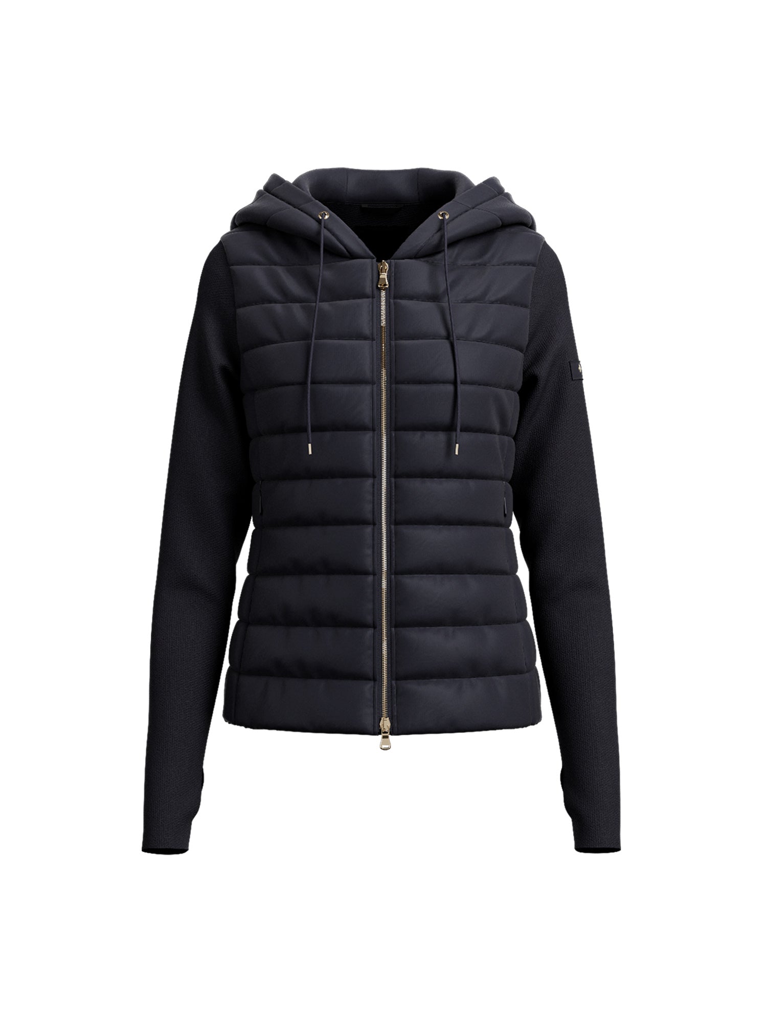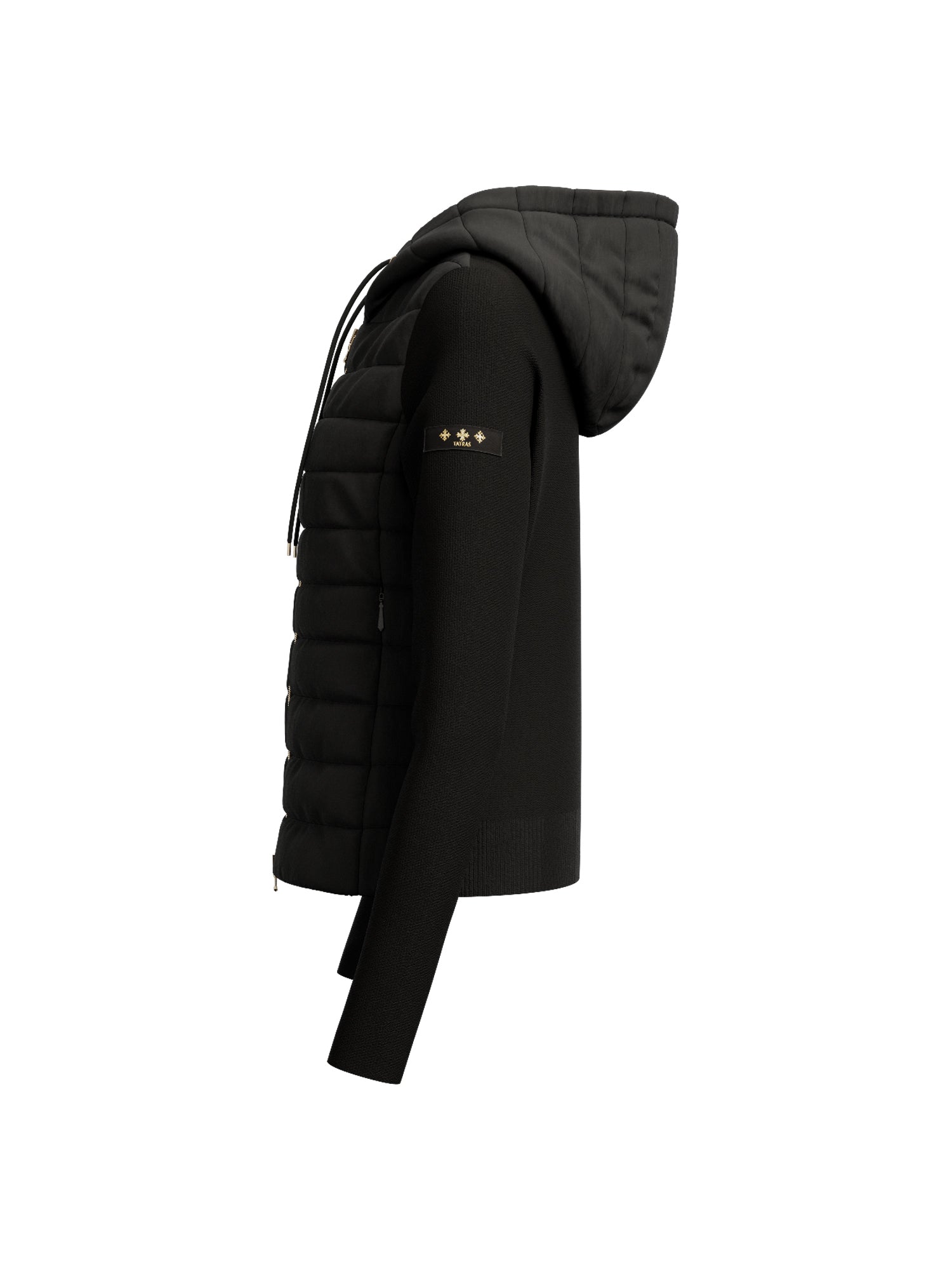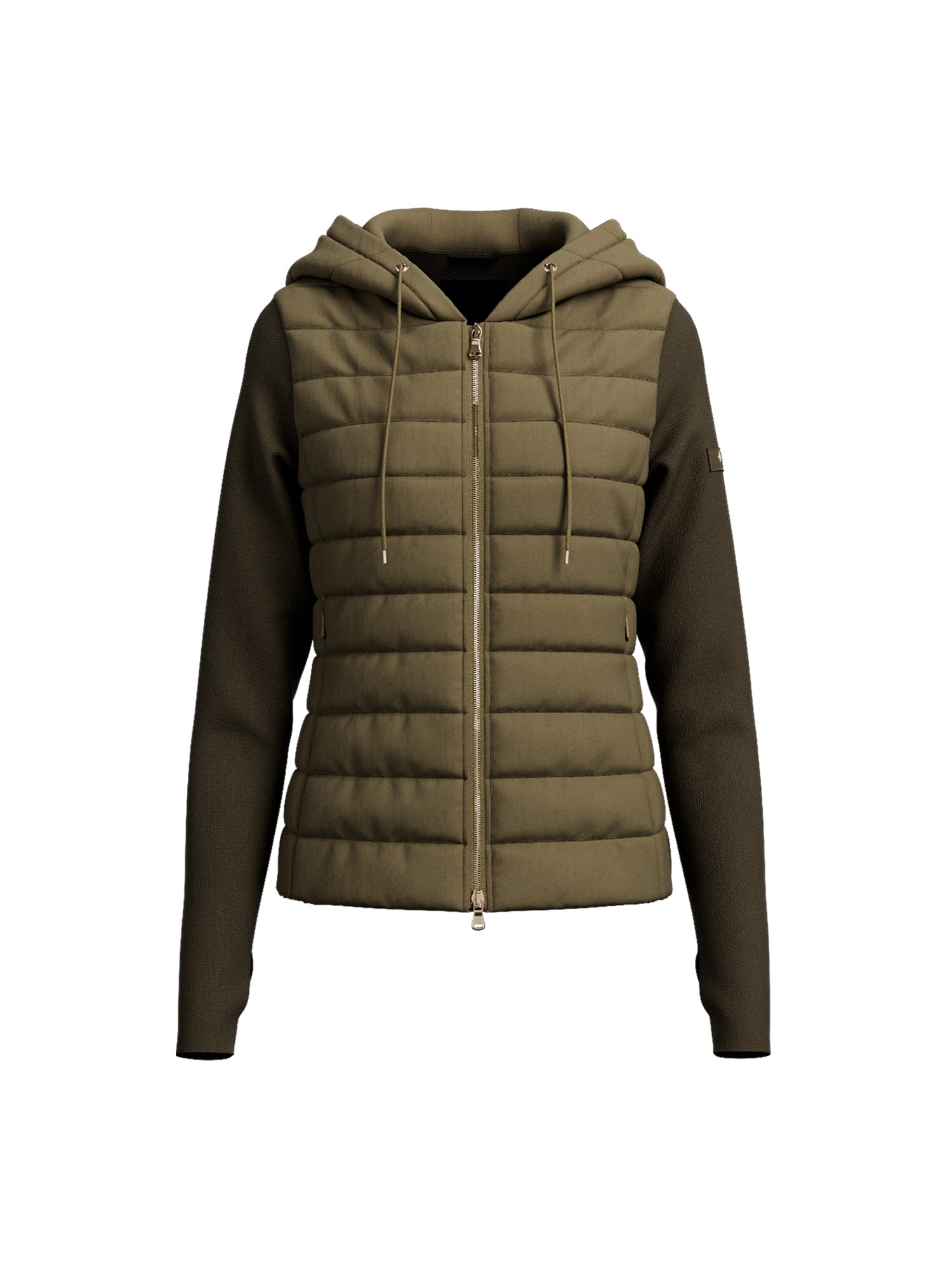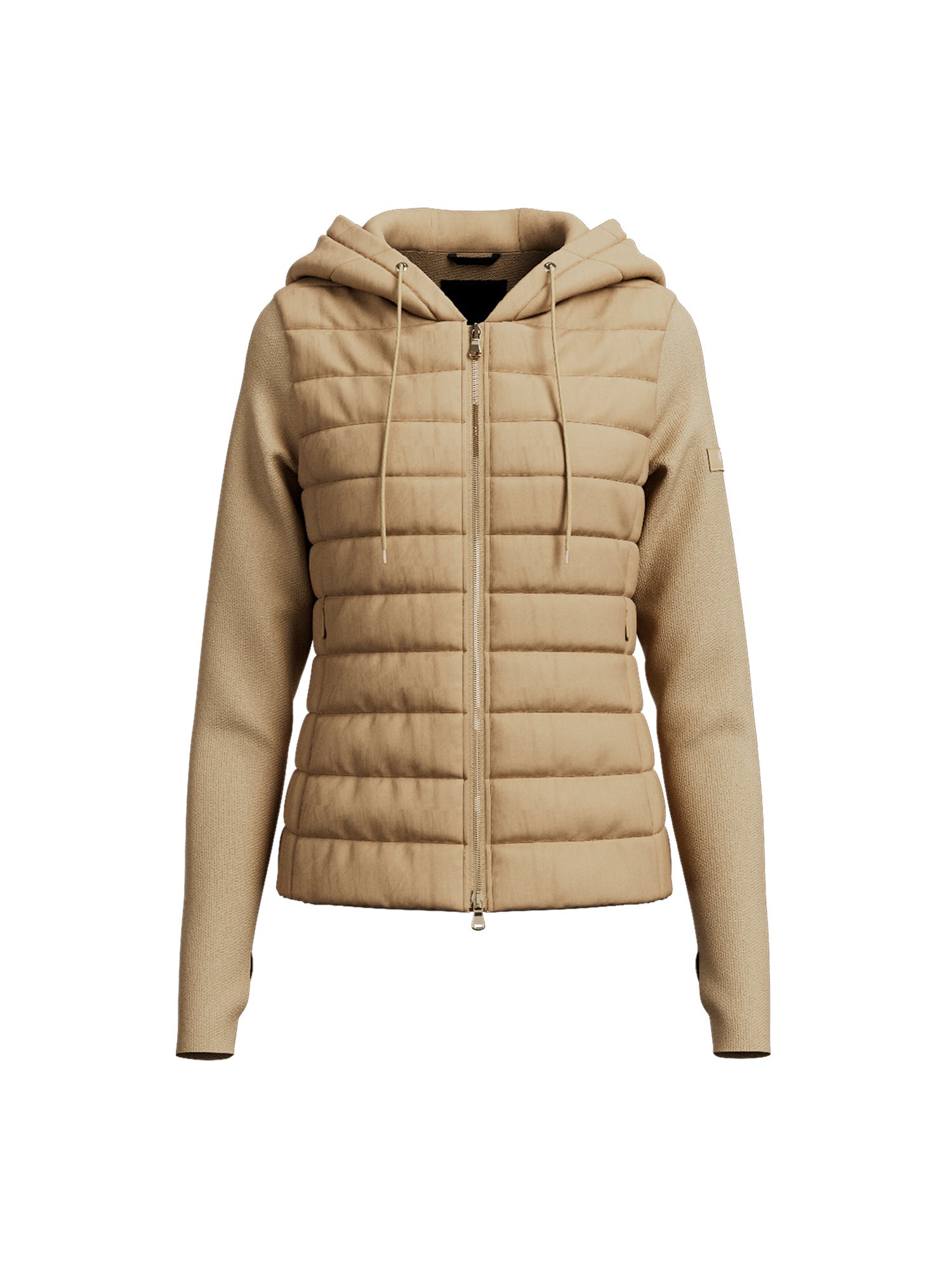 A lightweight down piece with a feminine, refined touch for those who want elegance without sacrificing comfort. The front is padded with slim down, while the back and sleeves are worked in honeycomb‑knit nylon that is breathable and pleasant on the skin. The clean, low‑neck hood lightens the design. Gold‑tone details such as the zip and drawcord echo TATRAS’ iconic style and add brightness to the garment.