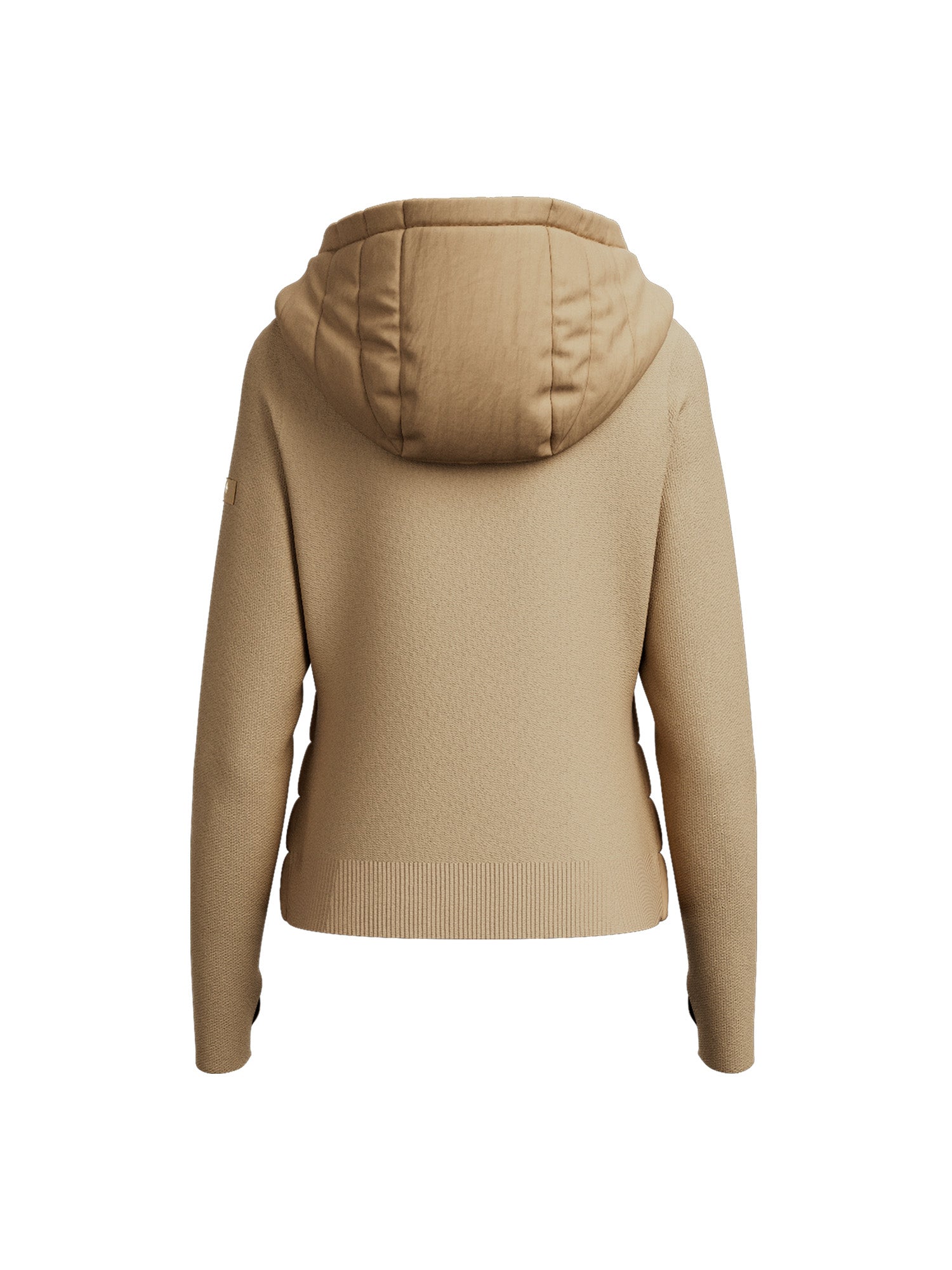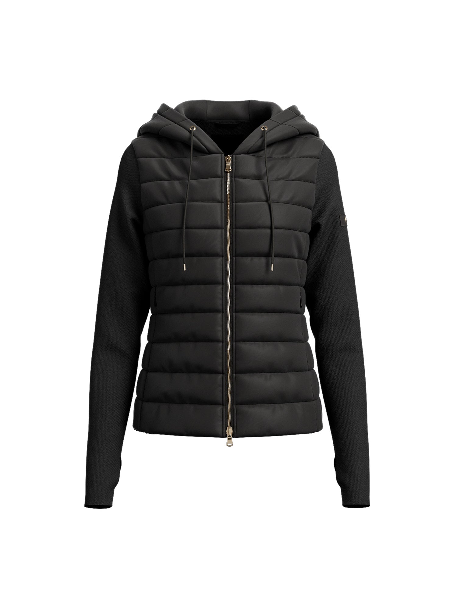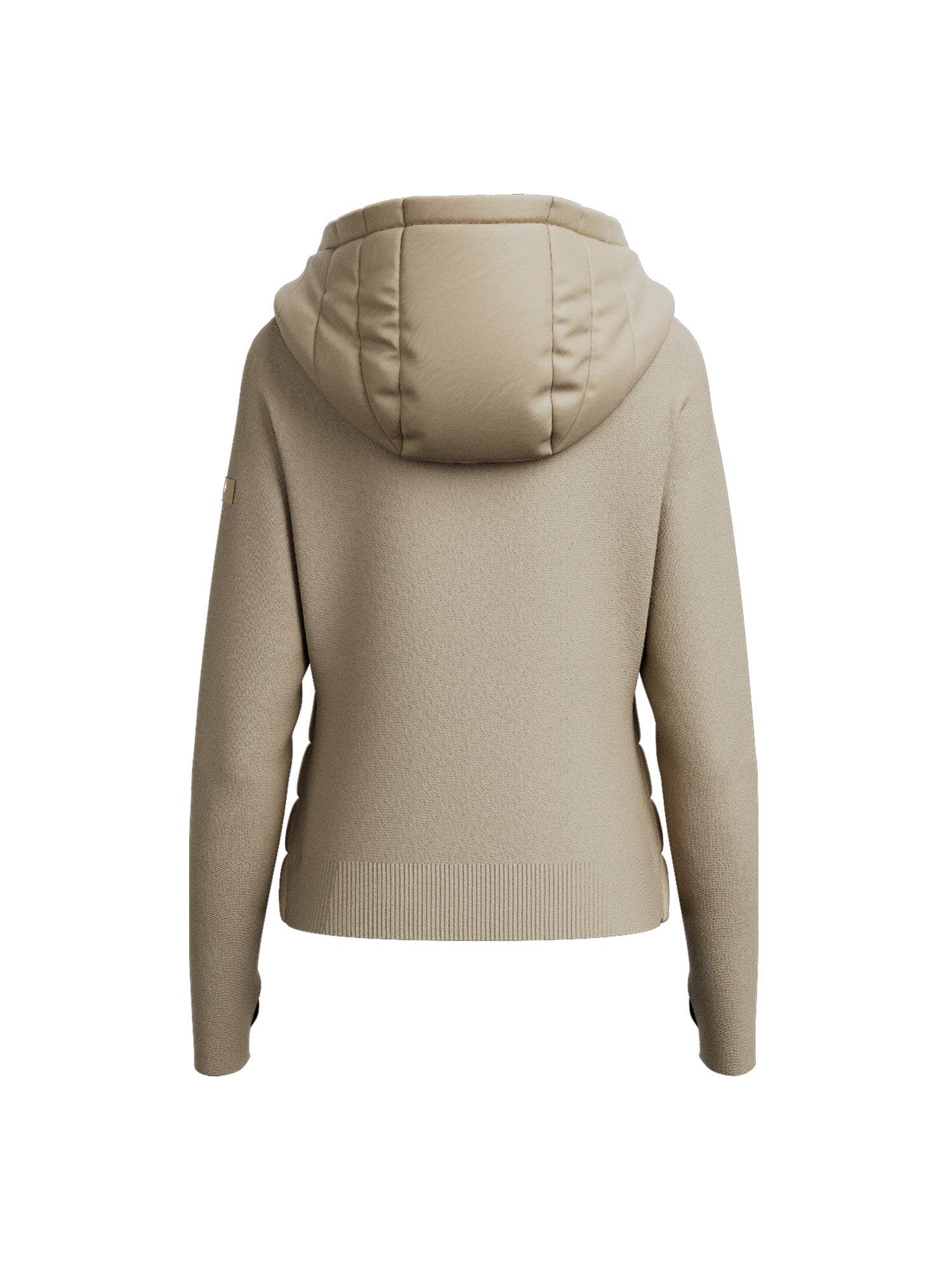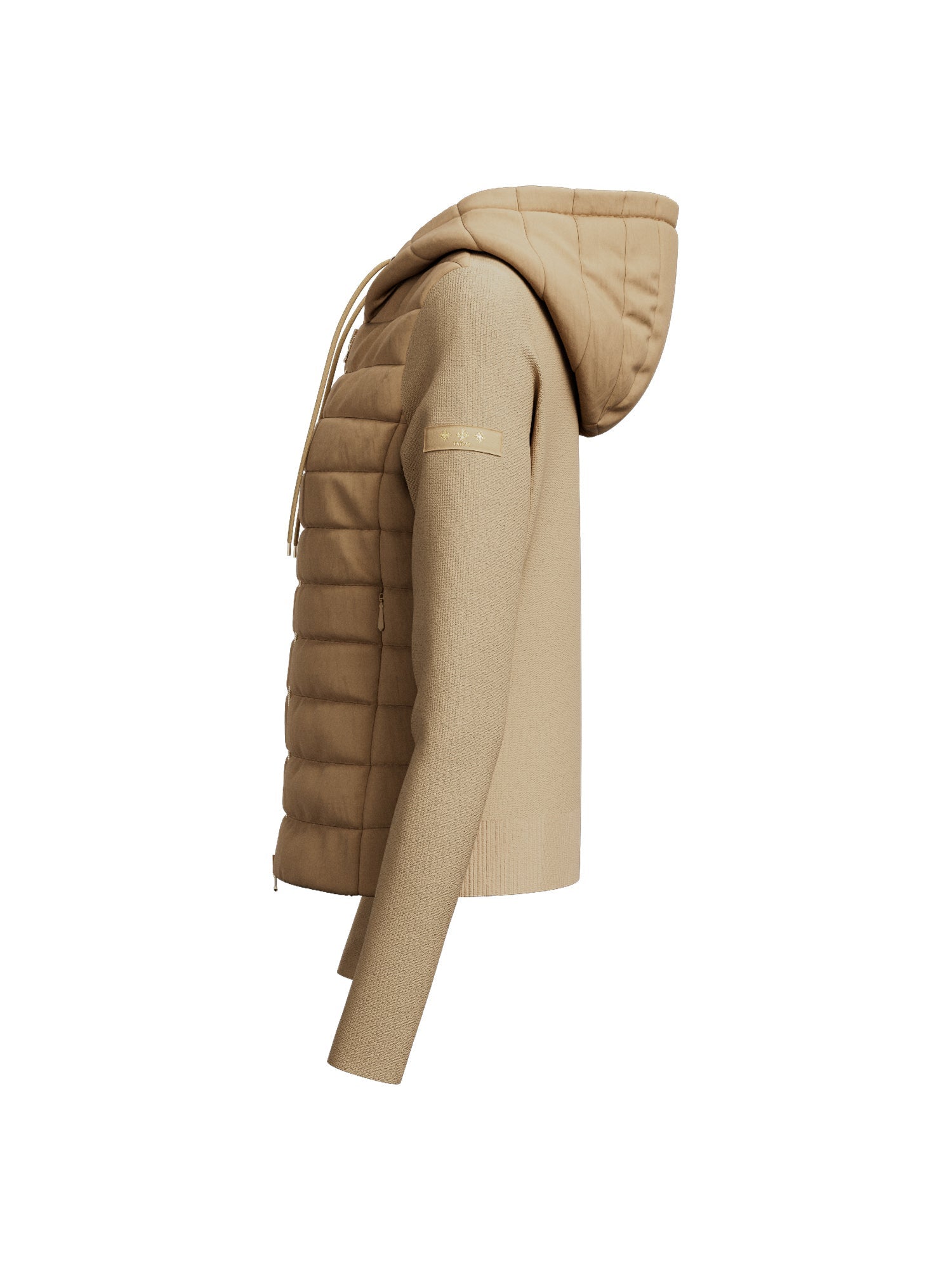A lightweight down piece with a feminine, refined touch for those who want elegance without sacrificing comfort. The front is padded with slim down, while the back and sleeves are worked in honeycomb‑knit nylon that is breathable and pleasant on the skin. The clean, low‑neck hood lightens the design. Gold‑tone details such as the zip and drawcord echo TATRAS’ iconic style and add brightness to the garment.